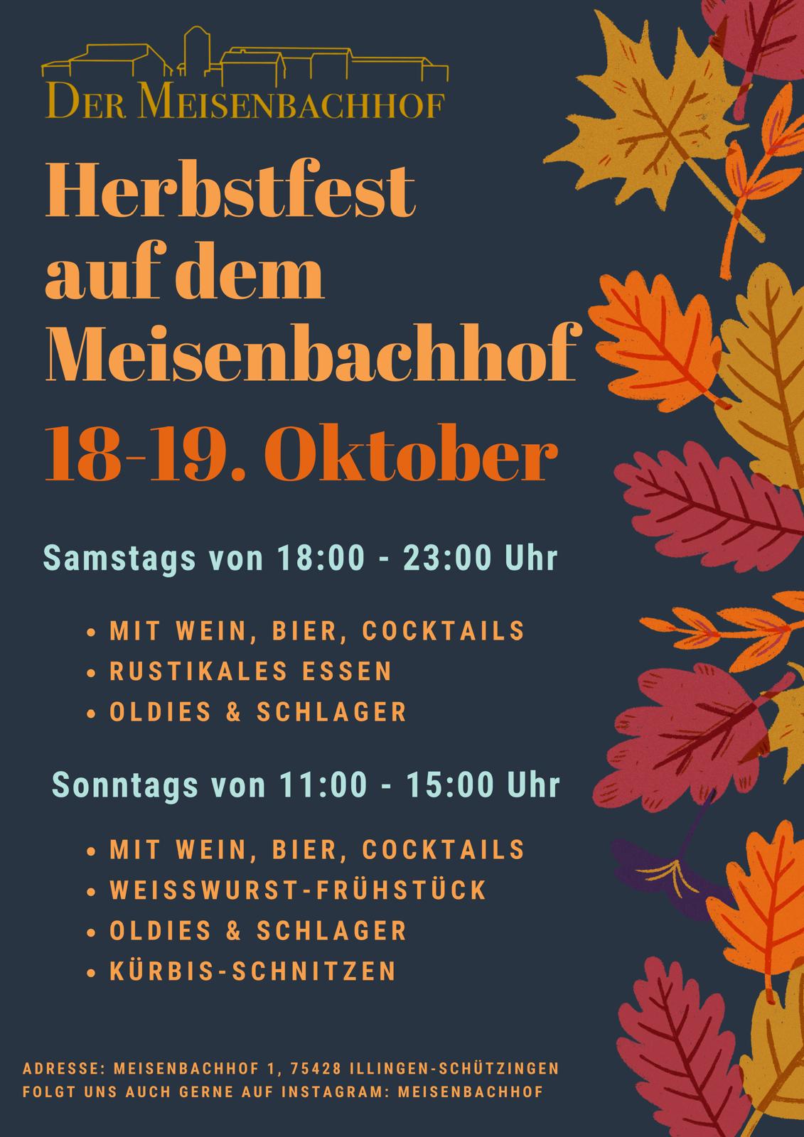 Am 18. und 19. Oktober laden wir herzlich zu unserem Herbstfest auf dem Meisenbachhof ein. Freut euch auf gemütliche Stunden, leckeres Essen, tolle Musik und herbstliche Highlights für Groß und Klein.
